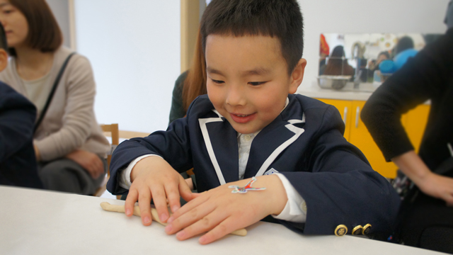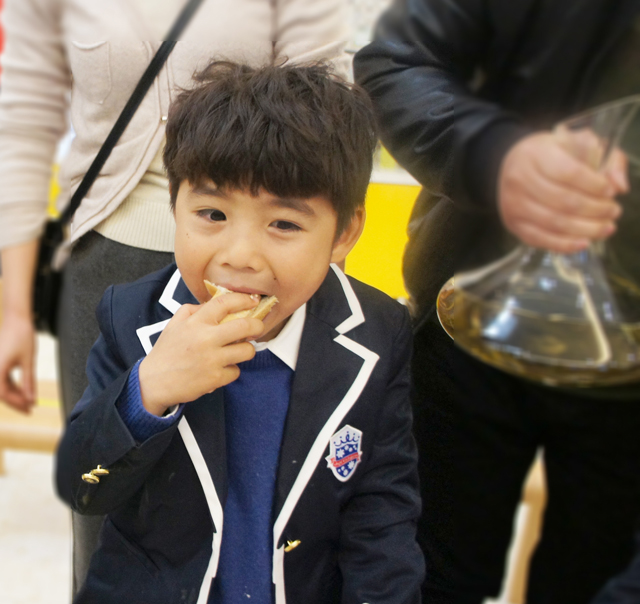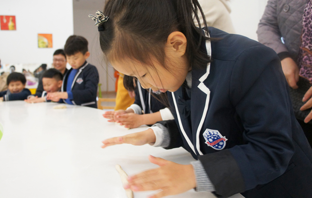 The second part is, our Kay teaches the kids to make famous Munich bread. Kay crossed hands on the chest, "bread shaped like a hug." hee hee, kids rub the dough, rub it longer and longer, crossed two times, then make it like a hug shape, coated the oil and put it into the oven.