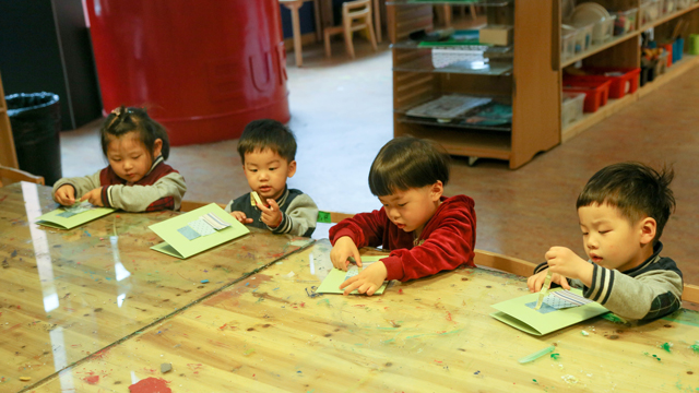 Under teachers’ guidance, color papers are firstly folded in half, then scraps of paper in various colors are glued to one side of them. Later, ribbons are attached which make them look like part of delicate gift boxes. But what are these for? When one side is completed, they start to dip paint with their fingers and then draw a heart in another side of the cards. Tender fingers press hard as if love is measured by the strengths of their pressings. To make it more like that of a mother, different hearts are glued inside the bigger one. Finally, a greeting card with deep love for mothers is finished. It’s not an easy task for these children to cut color papers into hearts of varied sizes, however, this is overcome through their hard work.