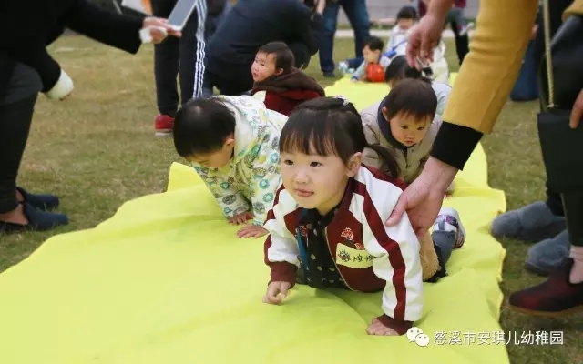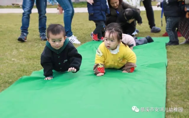 “宝贝向前冲”的游戏中,孩子们分成两组开始了充满趣味的比赛,家长们在一旁为孩子们加油,并引导孩子继续向前。