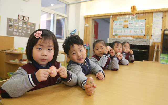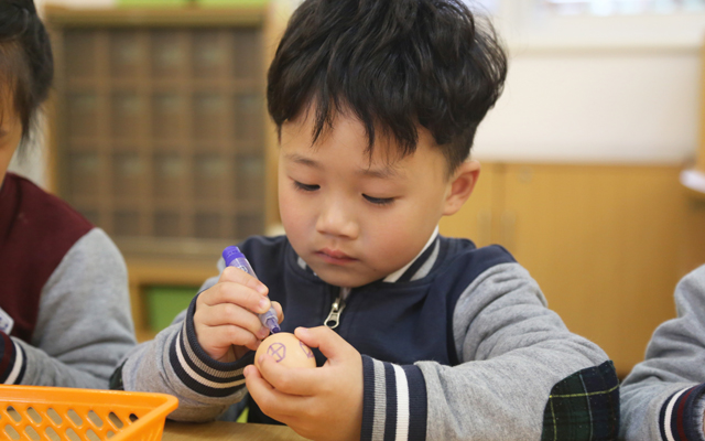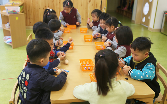 装饰完鸡蛋后,立蛋比赛正式开始了。只见孩子们两手拿着蛋,轻轻地立着放在桌子上,专注地盯着手里的鸡蛋。